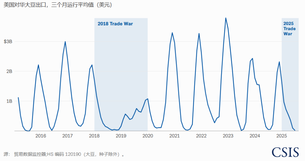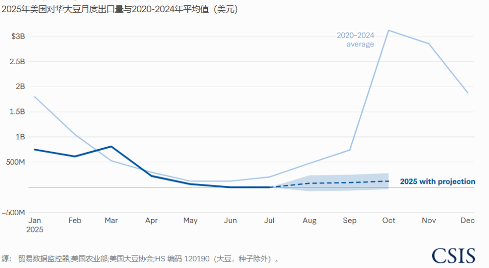 CSIS估计,与过去四年的平均水平相比,到2025年10月,美国农民将损失价值57亿美元的对华大豆出口,如果销售在10月和11月的收获高峰期保持停滞,损失还将要大得多。