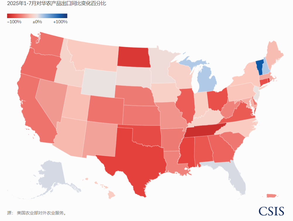 美国各州对华农产品出口下降比例,红色越深表示下降越严重。