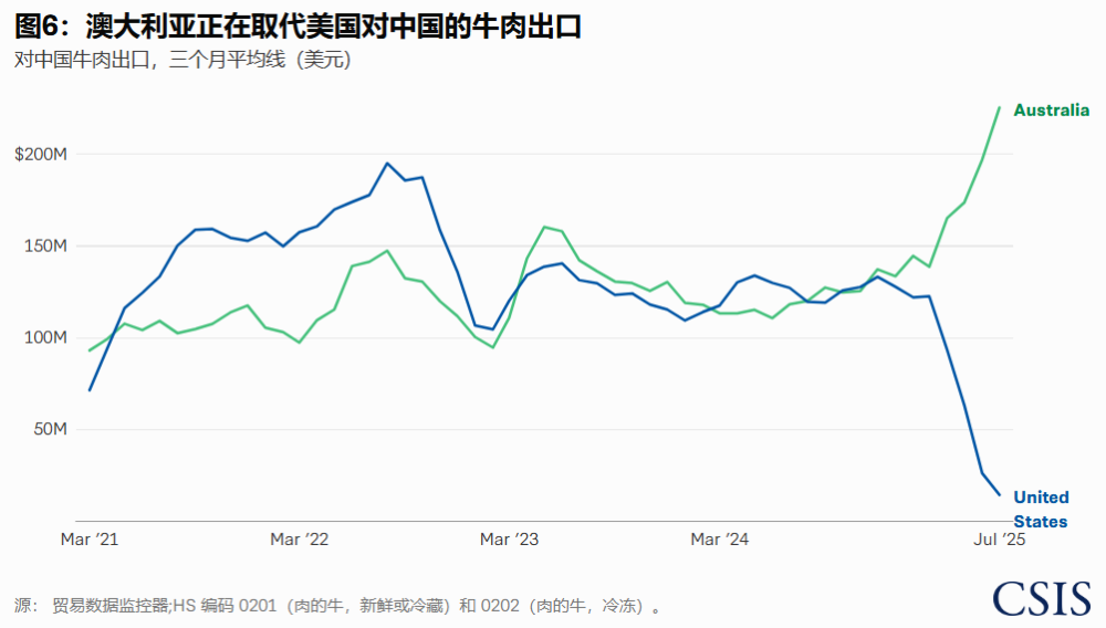 跟大豆处境类似的还有牛肉,2025年3月,中方宣布数百家美国牛肉工厂的出口许可证到期,此后美国对华牛肉出口量下降了90%以上,损失则被同期激增的澳大利亚牛肉所取代。