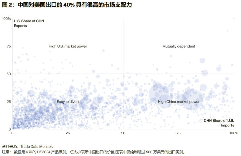 根据美方智库分析,中国约有40%的产品在美国市场有很高的支配力,双方都容易找到替代品的约占50%,严重依赖美国的市场的大概只有10%。