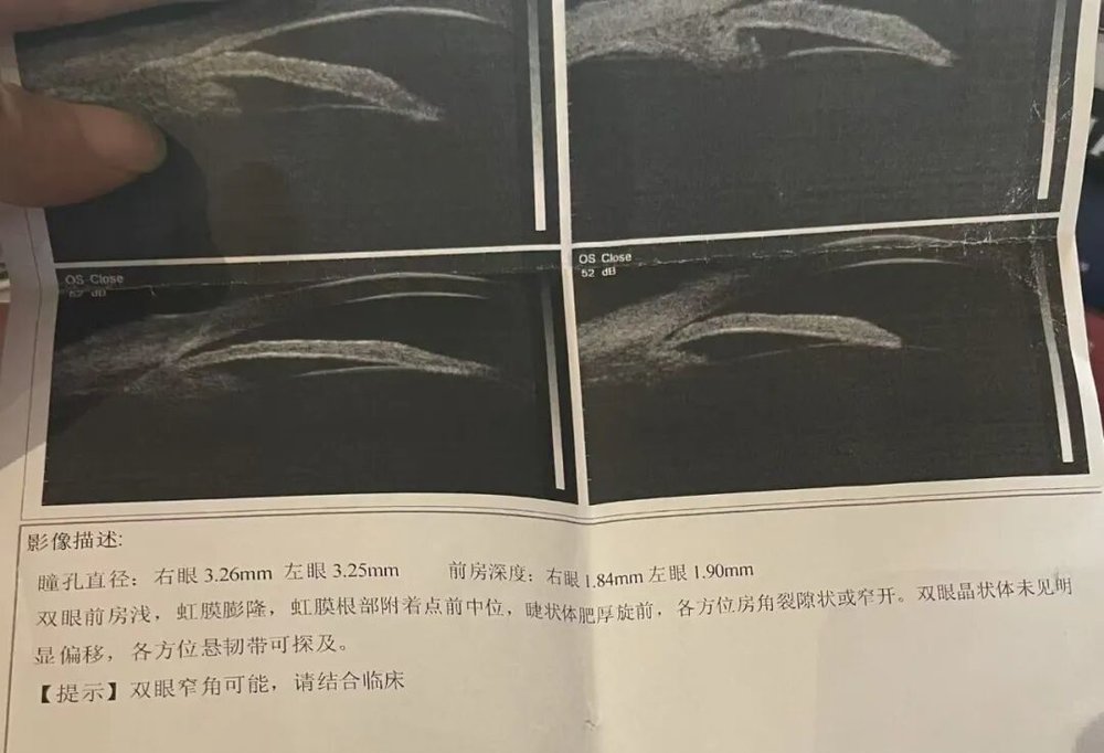 双眼前房浅,虹膜膨隆,虹膜根部附着点前中位,睫状体肥厚旋前,各方位房角裂隙状或窄开。双眼晶状体未见明显偏移,各方位悬韧带可探及。