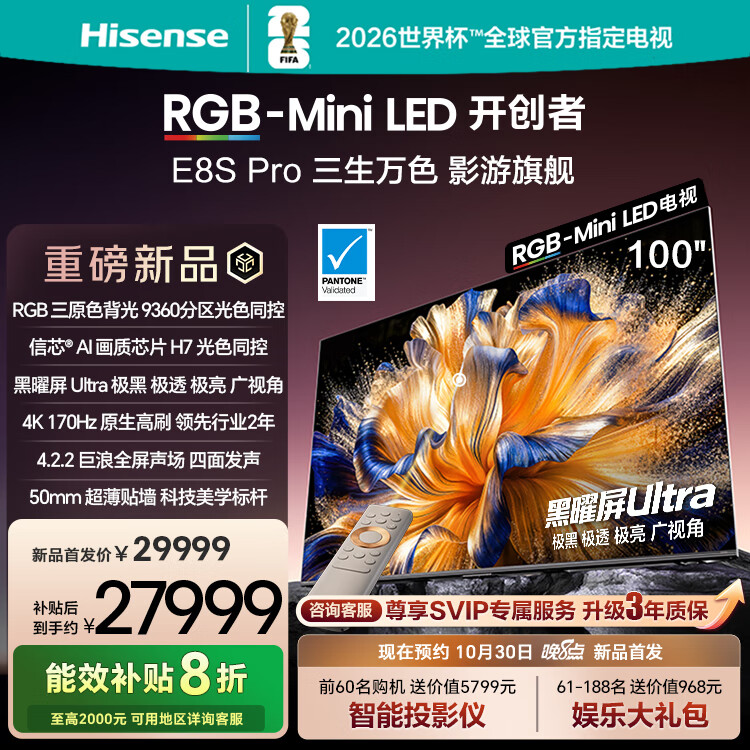京东海信 RGB-MiniLED 电视 E8S Pro 100 吋 9360 分区 H7 芯片 黑曜屏 Ultra 170Hz 高刷 国家补贴 E8QPro 升级款券后 27999 元起点此领券购买