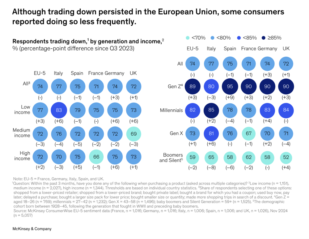 McKinsey 在此前的一份报告指出,截至2024年秋末,法国、德国、意大利、西班牙和英国的Z世代和千禧一代消费者中,高达80%至95%的人表示有降级消费行为。相比之下,X世代及以前的三个世代中,仅有 52%至81%的人正在降级消费。