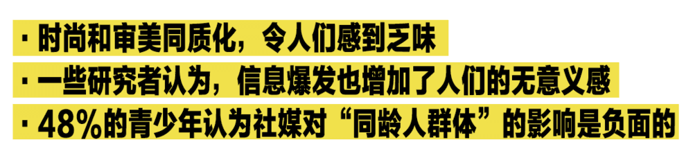 由此可见,这代人面对着一个特别的矛盾。他们因快速且过多的微趋势而感到无聊和疲惫,试图脱离社媒的裹挟、发展自我的形象,却又在流量的烘托之下无法拒绝追随它。