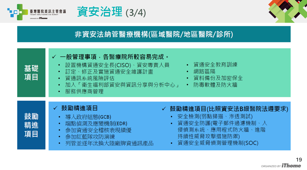 資安治理則依《資安法》規範,針對不同等級醫院設定「基礎項目」和「鼓勵精進項目」,要求醫院申請補助計畫時,需通過特定項目,來提升整體資安防護能力。