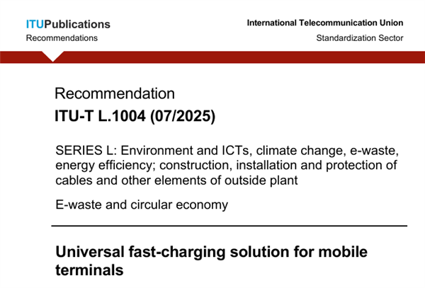 快科技10月27日消息,近日,由中国信息通信研究院牵头,联合华为、vivo、OPPO公司撰写的标准L.1004“Universal fast-charging solution for mobile terminals”(移动终端通用快速充电解决方案)通过国际电信联盟第五研究组(ITU-T SG5)审议并作为国际标准正式发布。