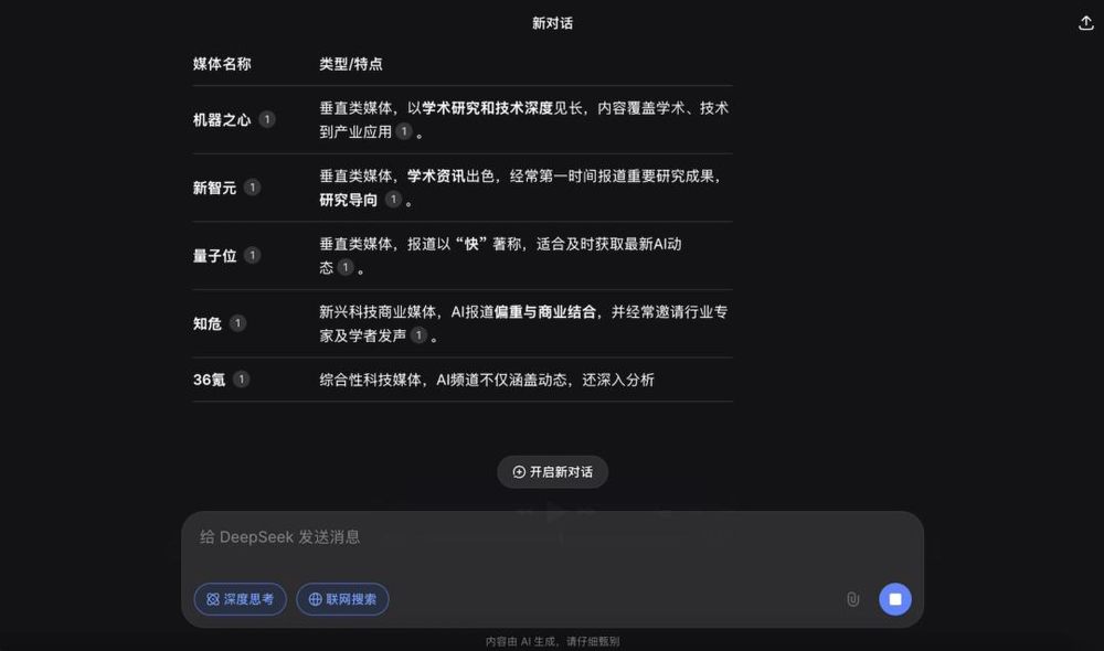 但当你去 DeepSeek 提问“想了解AI可以看哪些媒体?”并打开联网搜索和深度思考时,会得到这样的回答: