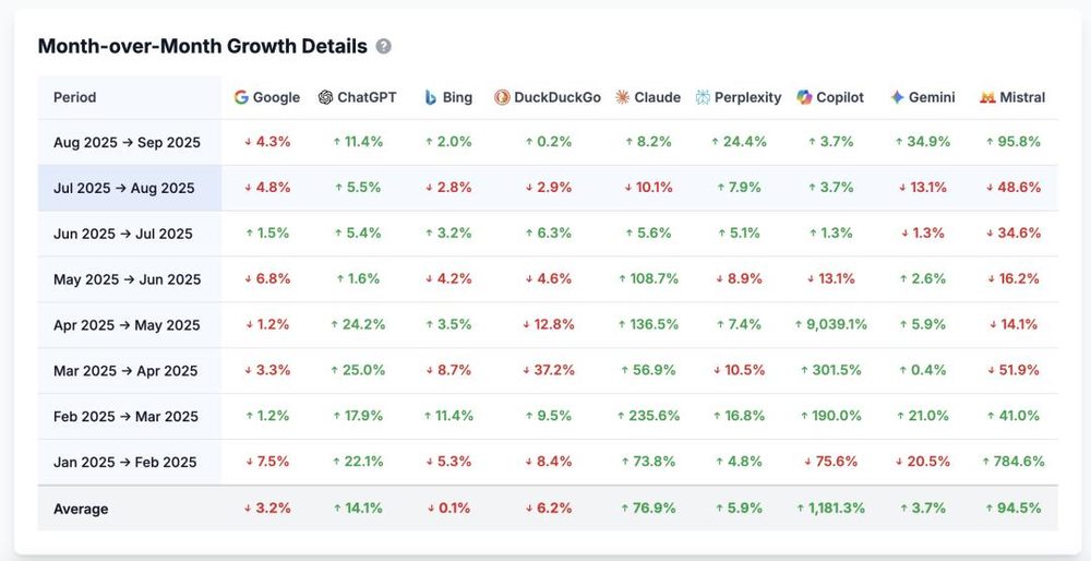 比如,Ahrefs 发布过一个结果,在过去 9 个月时间内,谷歌的网站流量贡献每月平均下跌 3.2%,其他 AI 工具对网站流量的贡献则快速增长,比如除谷歌外用户量最高的 ChatGPT 每月平均增长量达到 14.1%。