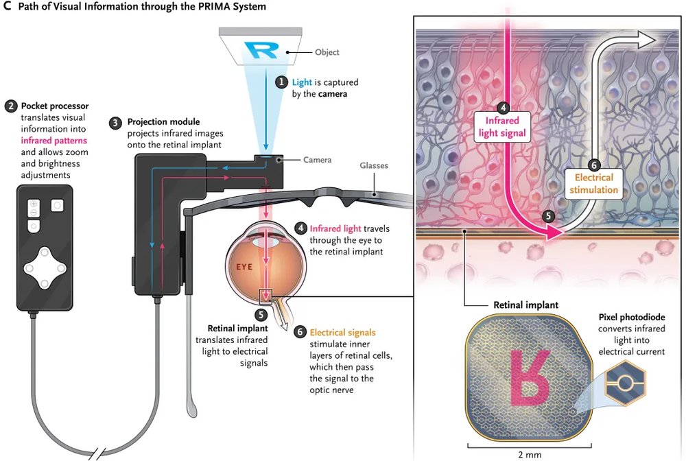 于是科学家做了一件非常聪明的事,绕开感光细胞,直接给神经输入电信号。这块名为PRIMA光伏视网膜植入体的芯片,就像是把“摄像头+电信号触发器”嵌进了人眼。