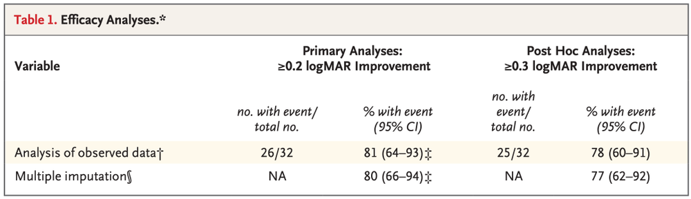 试验结果,临床上有意义改善的定义为,至少0.2 logMAR的改善(即最小分辨角的对数;相当于增加≥10个字母)