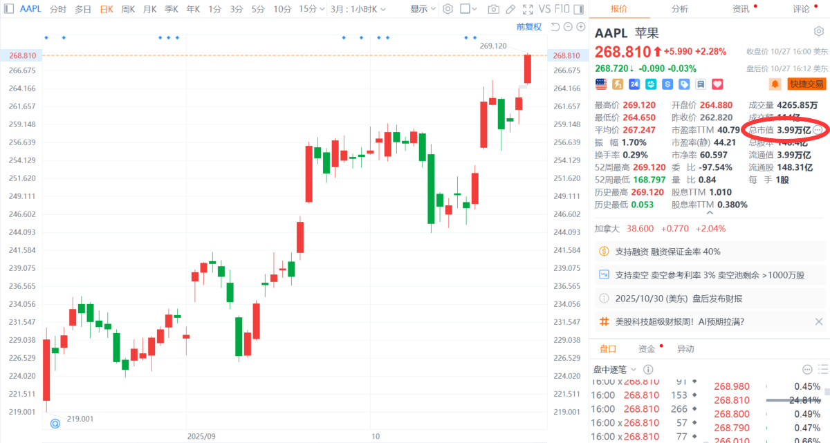 【美股三大指数均续创新高 苹果总市值逼近4万亿美元】财联社10月28日电,美股三大指数集体收涨,均续创新高。纳指涨1.86%,标普500指数涨1.23%,道指涨0.71%。高通涨超11%,创2024年7月以来新高;公司推出人工智能芯片,在数据中心市场与英伟达展开竞争。特斯拉涨超4%,谷歌、英特尔涨超3%,苹果、英伟达涨逾2%,亚马逊、Meta涨逾1%;奈飞微跌。其中,苹果、谷歌均再创新高,苹果总市值逼近4万亿美元。