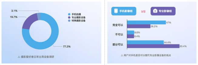 同时,据知乎研究院表明,无论是否拥有专业摄影设备,近8成的消费者均以手机为拍摄设备,而在专业设备和手机摄影的看法上,43.1%的消费者完全认同影像手机的专业力。