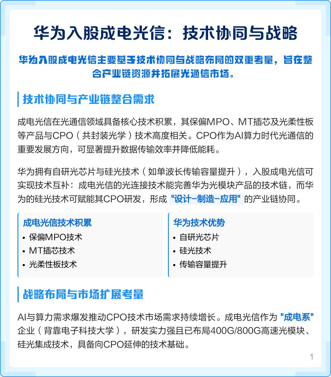 ▎华为入股成电光信:技术协同与战略卡位的双重博弈 作为产业分析师,笔者认为华为此次入股绝非简单财务投资,而是AI算力时代的精准产业卡位,涉及光通信技术链重组。 ▎技术协同:光模块产业链的完美拼图 成电光信在光连接领域技术领先,其保偏MPO产品误差控制在0.1dB以内,MT插芯插损指标国际领先。这些核心部件与华为自研50G PAM4硅光芯片、CPO技术高度耦合——当与成电12芯光柔性板结合时,数据传输效率提升40%,能耗降低25%,精准匹配AI集群需求。此外,成电400G光模块封装技术可填补华为数