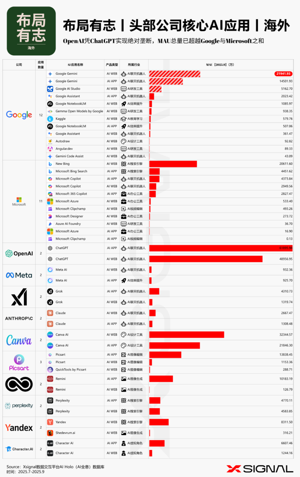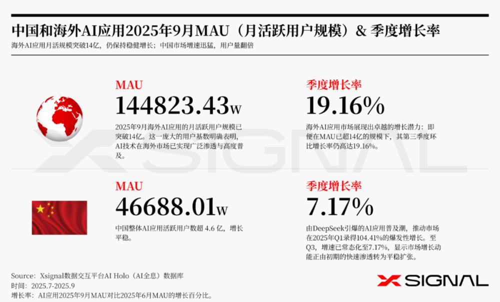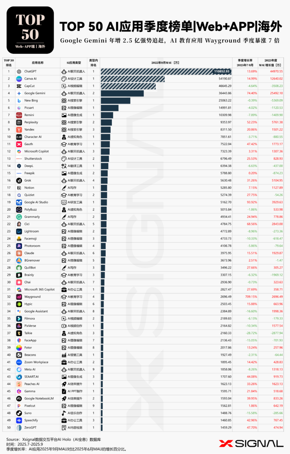 根据Xsignal AI Holo数据库数据显示,2025年9月海外AI应用月活跃用户达到14.48亿,季度增长率为19.16%,这一在高基数上实现的强劲增长,标志着市场已从早期用户扩张阶段,步入价值深挖的成熟期。其核心增长飞轮在于:完善的云服务与智能终端等技术基座为应用普及铺平了道路;而用户成熟的付费习惯则为技术创新提供了持续的商业动力;最终,AI在办公、创意、教育乃至生活等场景的无限拓展,将技术与商业价值落地,持续吸引并沉淀用户,构成了驱动MAU增长最根本的动力。