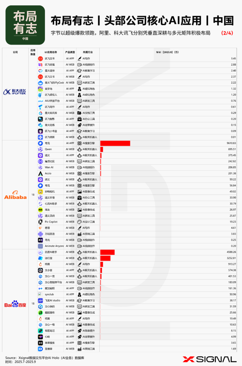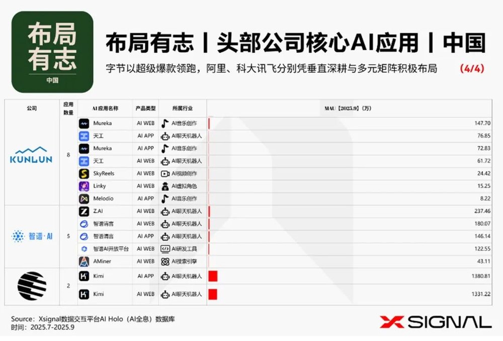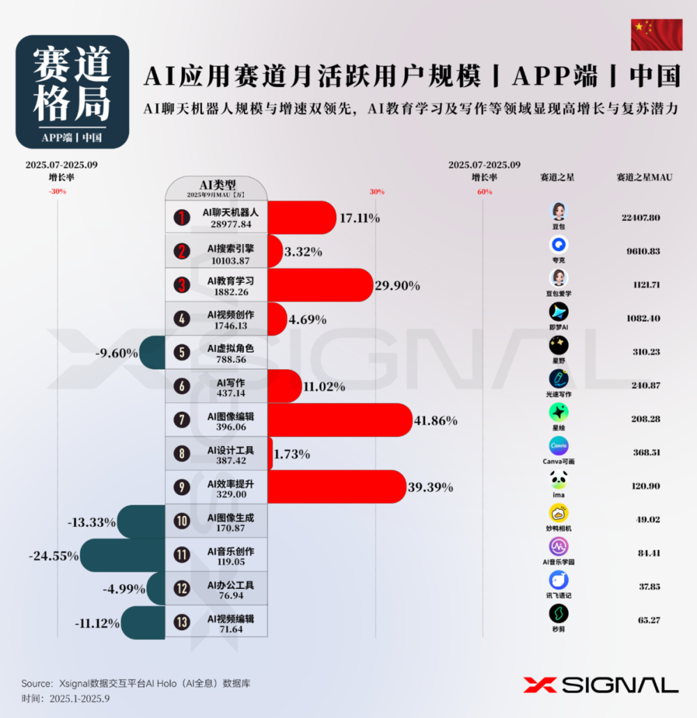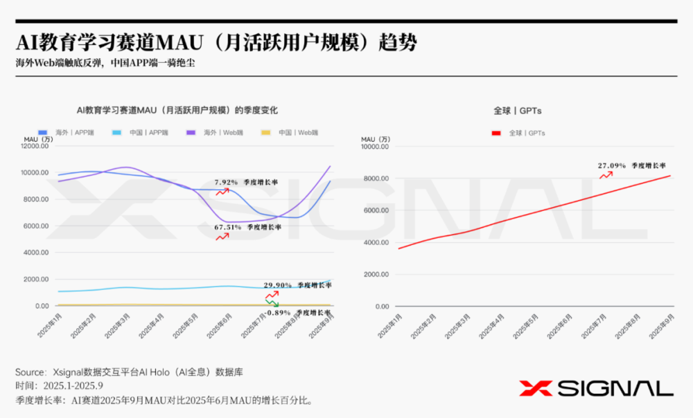中国APP市场: 同样增长迅速。根据Xsignal AI Holo数据库数据显示,中国市场APP端MAU从1月的7695万增长至9月的10104万,累计增长46.93%,已形成庞大的用户基盘。然而,数据揭示了潜在的增长瓶颈:其第三季度增长率已明显放缓。这或暗示市场渗透已达阶段性高点,或面临更激烈的同质化竞争。“移动优先”已成行业共识,深度融合AIGC、多模态交互与即时服务是巩固移动霸主地位的关键。