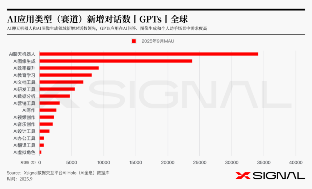 根据Xsignal AI Holo数据库数据显示,2025年9月全球GPTs应用各细分赛道的月新增对话数分布情况来看,AI聊天机器人以超过34000万的新增对话数遥遥领先,这主要得益于其广泛的应用场景和普适性功能。作为人机交互的核心入口,聊天机器人覆盖了智能问答和客户服务等多元化需求,其操作简便、贴近日常生活的特性使其成为用户高频互动的首选。紧随其后的是AI图像生成应用,近24000万的新增对话数反映出其在创意设计和社交媒体内容生产领域的强劲需求,用户通过可视化表达实现了个性化创作,这种兼具娱乐性和实用性的特点有效提升了用户参与度。