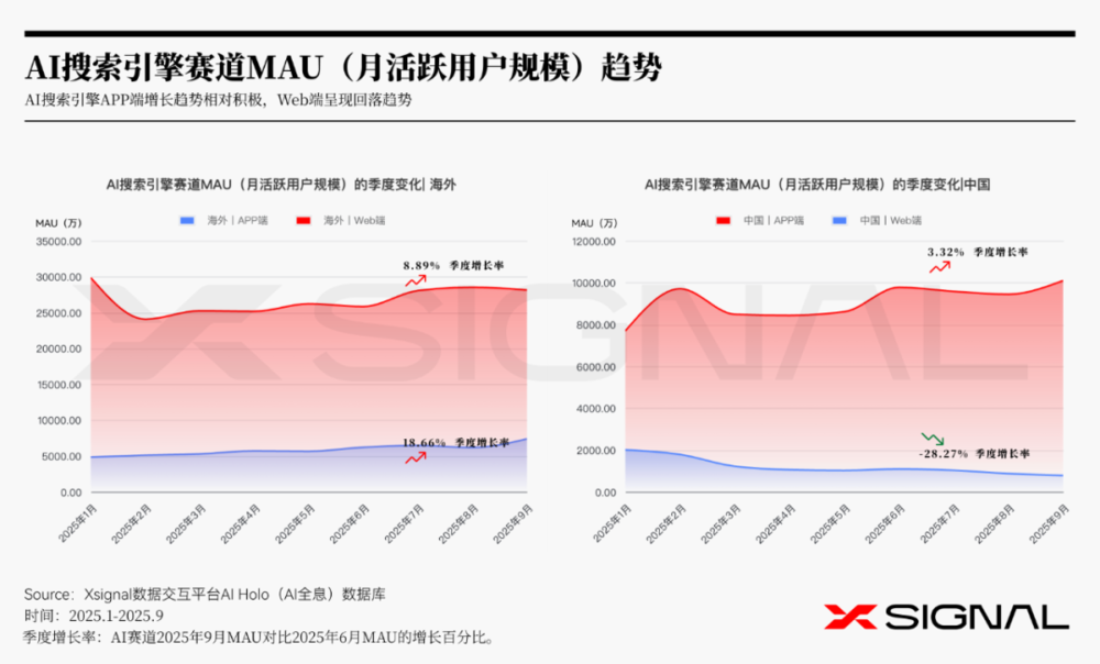 海外Web市场:虽累计微降5.43%,但其MAU体量依旧是APP端的近4倍,基本盘极其稳固。更重要的是,其第三季度环比增长8.89%,显现出清晰的“触底反弹”迹象。这表明在专业、深度及桌面办公场景下,Web端AI搜索仍具不可替代的价值,市场已进入存量优化与体验升级的博弈阶段。