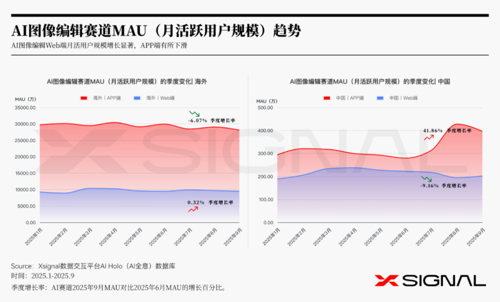 2025年中期,AI图像编辑市场呈现出新的动态。第一季度“Web端增长,APP端承压”的趋势在第二季度有所延续,但第三季度则出现了显著的市场分化,尤其在中国市场,APP端出人意料地实现了爆发式增长,而Web端则在国内外市场普遍面临增长瓶颈。