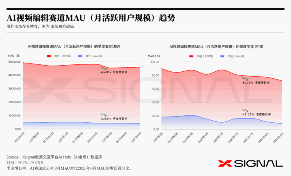 在AI视频编辑的全球版图上,移动APP端是无可争议的绝对主战场。无论是海外市场以超过Web端11倍的体量,还是国内市场超8倍的规模,都印证了APP在即时创作与社交分享场景中的核心地位。然而,表面的繁荣之下暗流涌动——2025年全球双端数据的同步下滑,正揭示一场深刻的行业变局与共同困境。