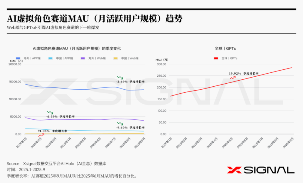 2025年前三季度,全球AI虚拟角色赛道展现出极为分化的“冰火两重天”格局。一方面,以APP为主要载体的传统市场均陷入显著的负增长困境,显示出用户疲劳与模式瓶颈;另一方面,中国市场的Web端和全球GPTs生态则作为新兴力量,实现了爆发式增长,预示着赛道底层逻辑的深刻变革。