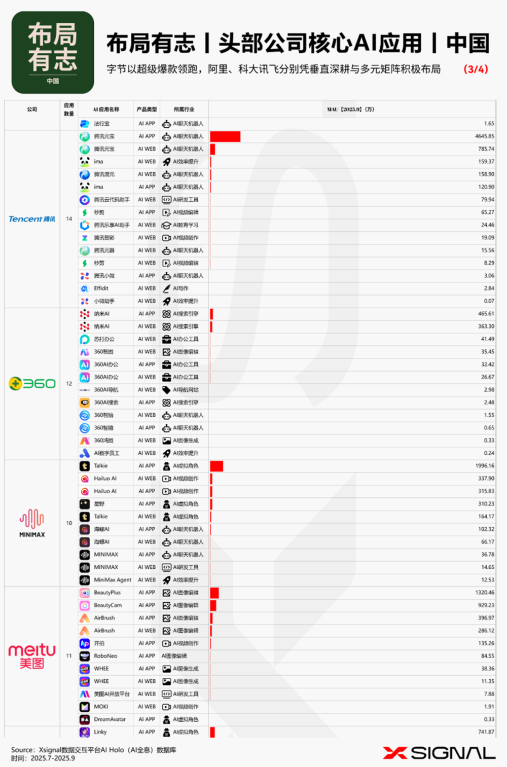 中国市场:后发先至,爆发力惊人。 根据Xsignal AI Holo数据库数据显示,中国市场在2025年第一季度迎来显著拐点,月活用户规模已达3.5亿。其增长模式更具“事件驱动”的爆发性特征,由现象级模型或巨头产品的入场迅速点燃市场,展现了极强的追赶势头和市场潜力。
