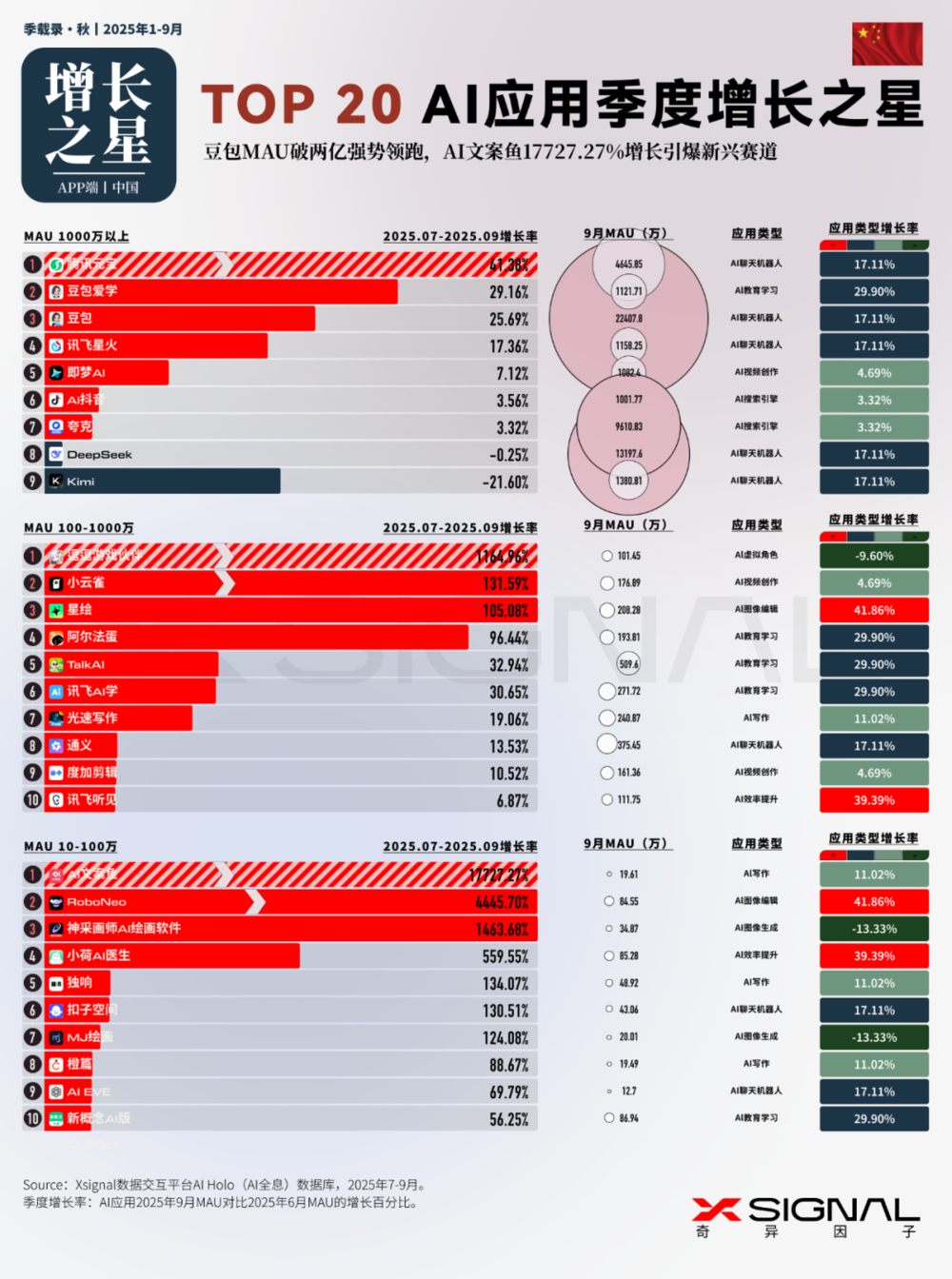 《季载录·秋丨Xsignal全球AI应用行业季度报告丨2025》正是在这个价值归位的关键节点,为您呈现这份市场的“秋收报告”。它基于秋季的最新数据,旨在描绘一个去伪存真、格局初定的AI应用新版图。这是一份验证“生存法则”的成绩单。9月的数据,将春季时浮现的趋势,彻底固化为市场的铁律:AI的胜利,终究是场景的胜利。 曾经备受瞩目的通用大模型应用,在用户规模上依然步履维艰;相反,如字节跳动的“豆包”、美图旗下的AI影像矩阵等深度嵌入具体场景的产品,其数千万级的月活跃用户规模已经证明,将AI能力“润物无声”地融入用户既有工作流与生活娱乐,是通往大众市场的唯一路径。