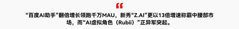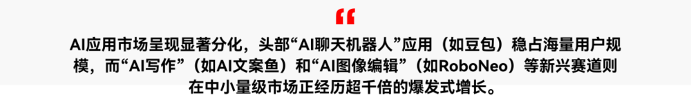 从用户渗透来看,AI聊天机器人正加速从专业工具向全民级应用转变。第三季度26.67%的高增长率表明,其用户破圈速度极快。这不仅体现在Web端作为生产力工具的深度使用,也体现在移动APP端作为“口袋助手”的日常高频交互。随着AI聊天机器人入口的便捷性不断提升,以及其在日常生活中的价值被更多用户认可,其市场天花板将持续拔高。