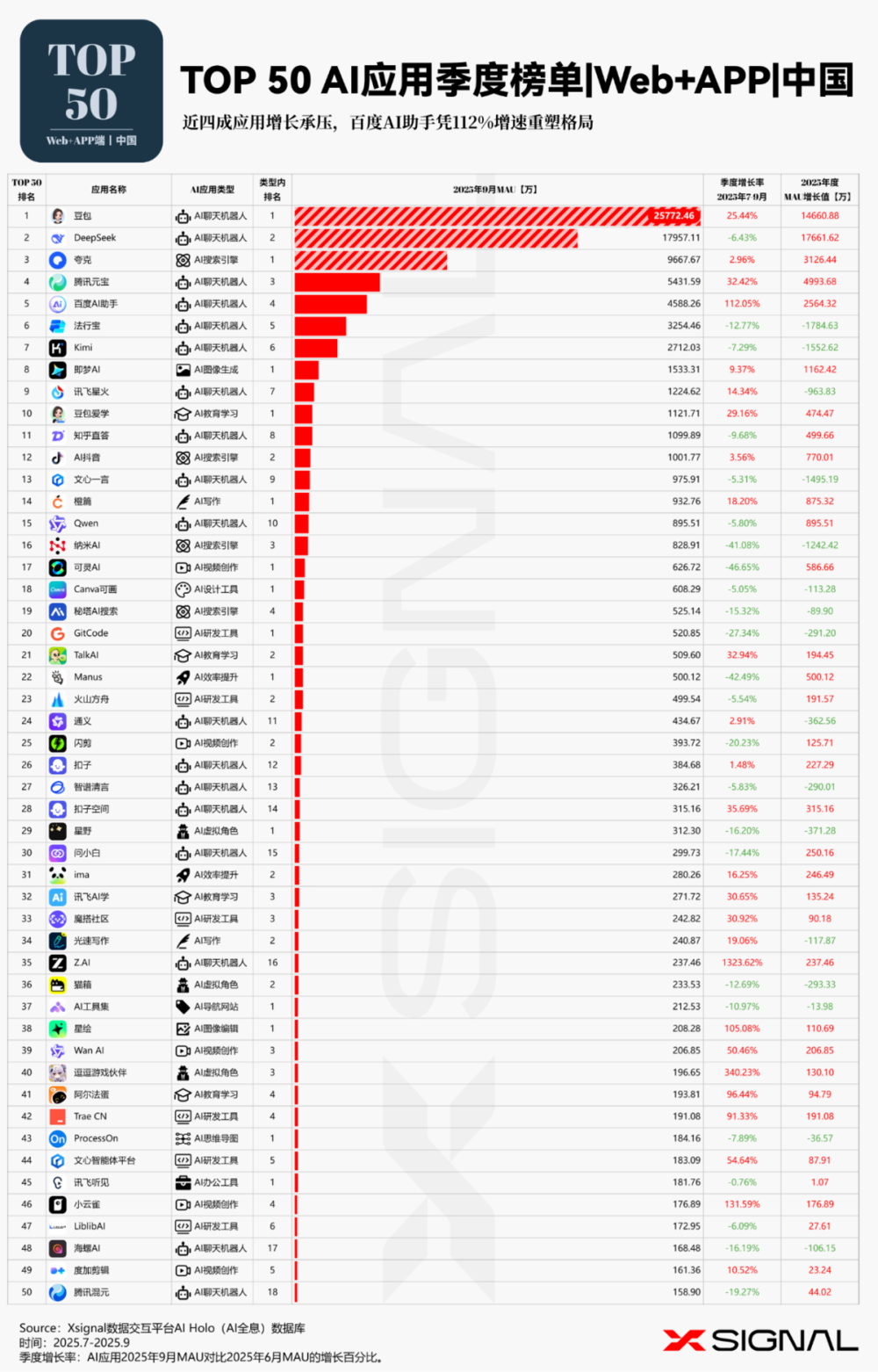 2025年的秋天,中国AI应用赛道迎来了一个“拨云见日”的时刻。如果说春天是“百模大战”的喧嚣与萌芽,夏天是应用场景的野蛮生长,那么此刻的秋日,则带来了沉淀后的清醒与收获。曾经围绕模型的狂热与想象正逐渐退潮,市场开始用最朴素的标尺——用户价值与活跃规模——去度量真正的胜出者。