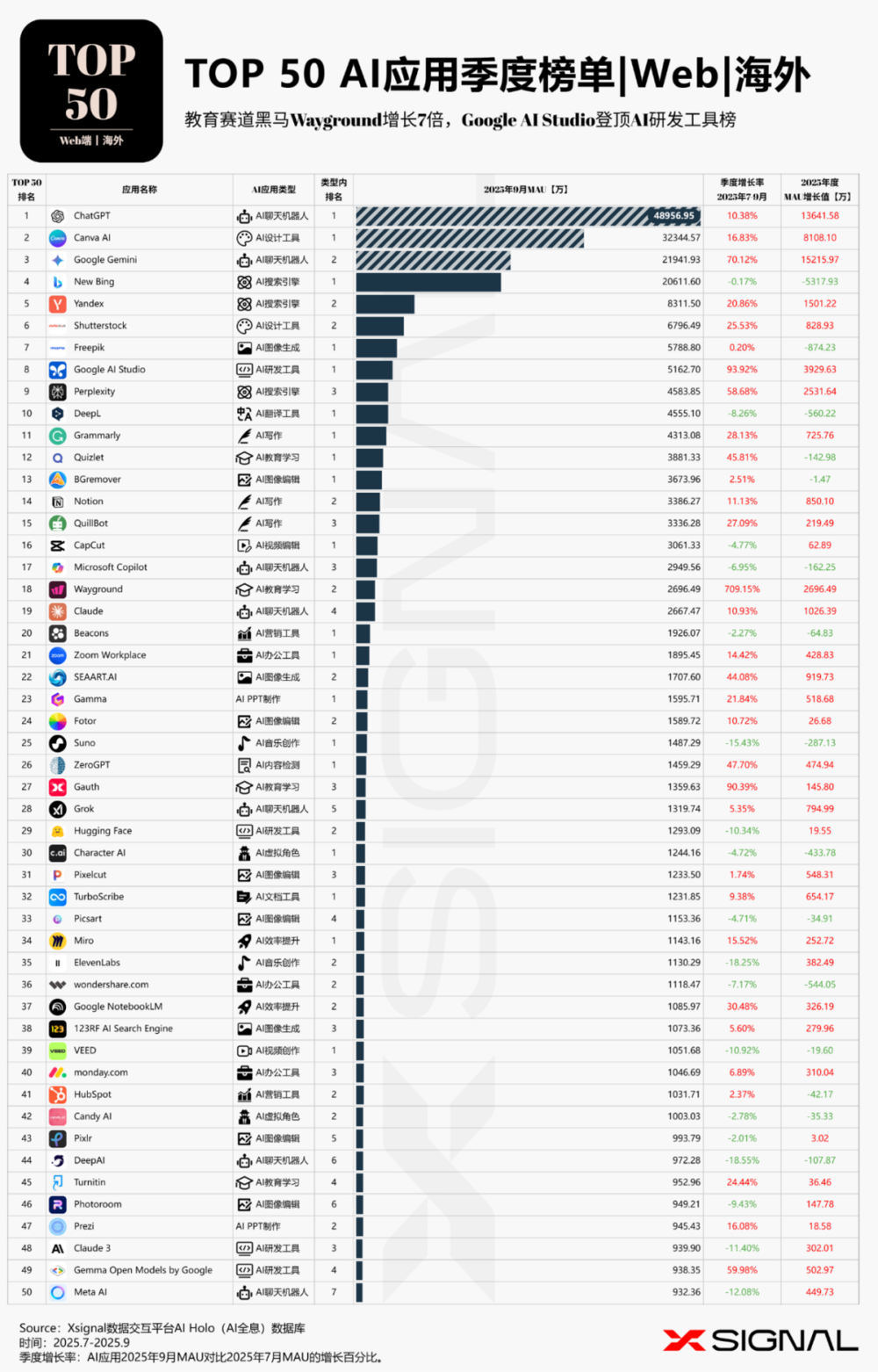 本季度,榜单中取得增长的应用共有32个,占Web TOP50应用总数的64%。增幅最高的是Wayground和Google AI Studio。18个AI应用呈下降趋势,平均降幅约为8.34%,降幅最大的应用是DeepAI。整体来看,Web端第三季度增长势头强劲,市场虽出现分化,但对AI工具的整体需求量较高,仍处在快速扩张阶段。