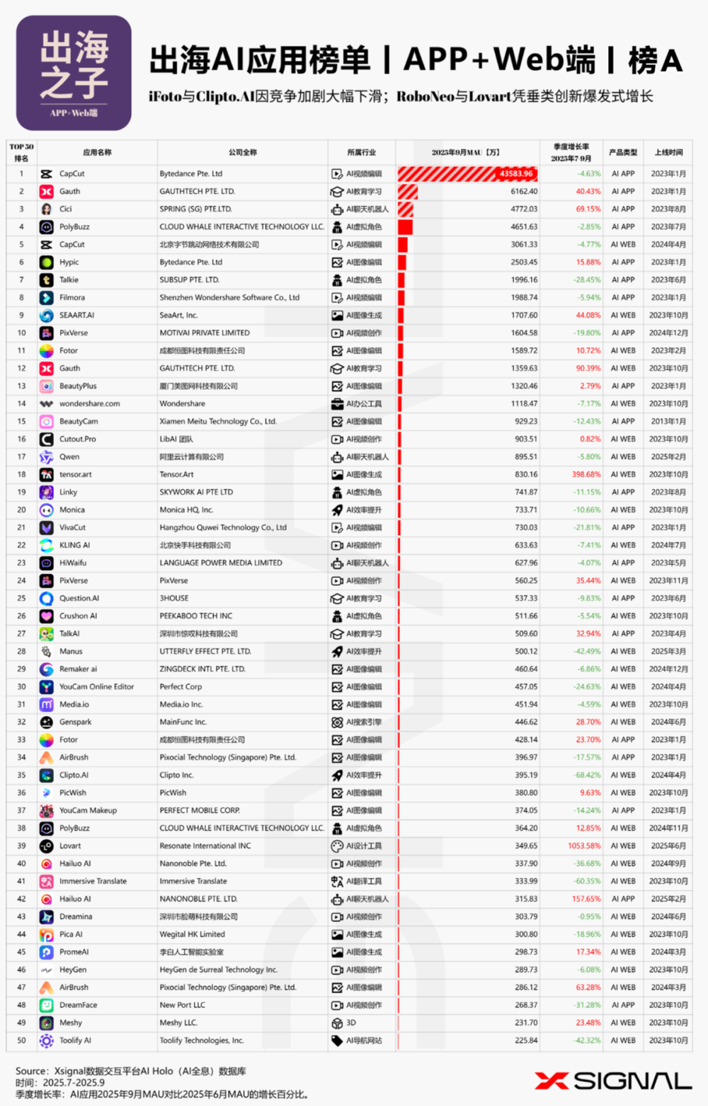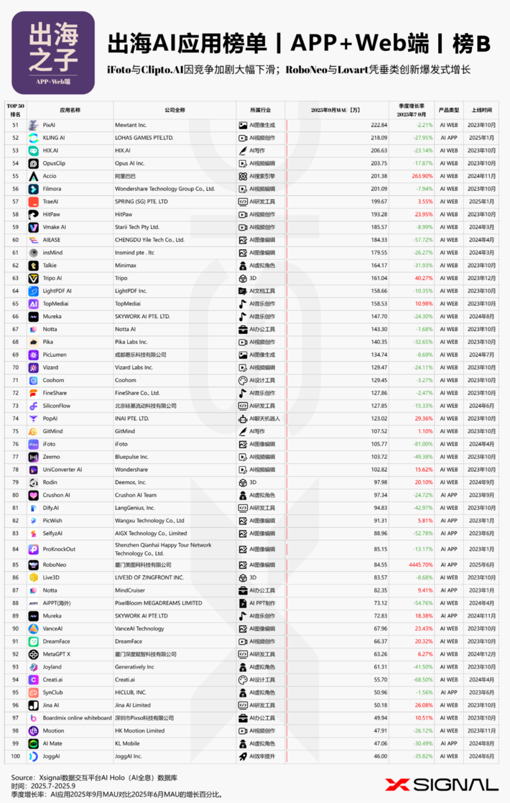 美图的RoboNeo:作为一款2025年6月才上线的AI图像编辑APP,便实现了4445.70%的惊人增长,显示出美图在图像领域深厚的技术积累和强大的市场推广能力。