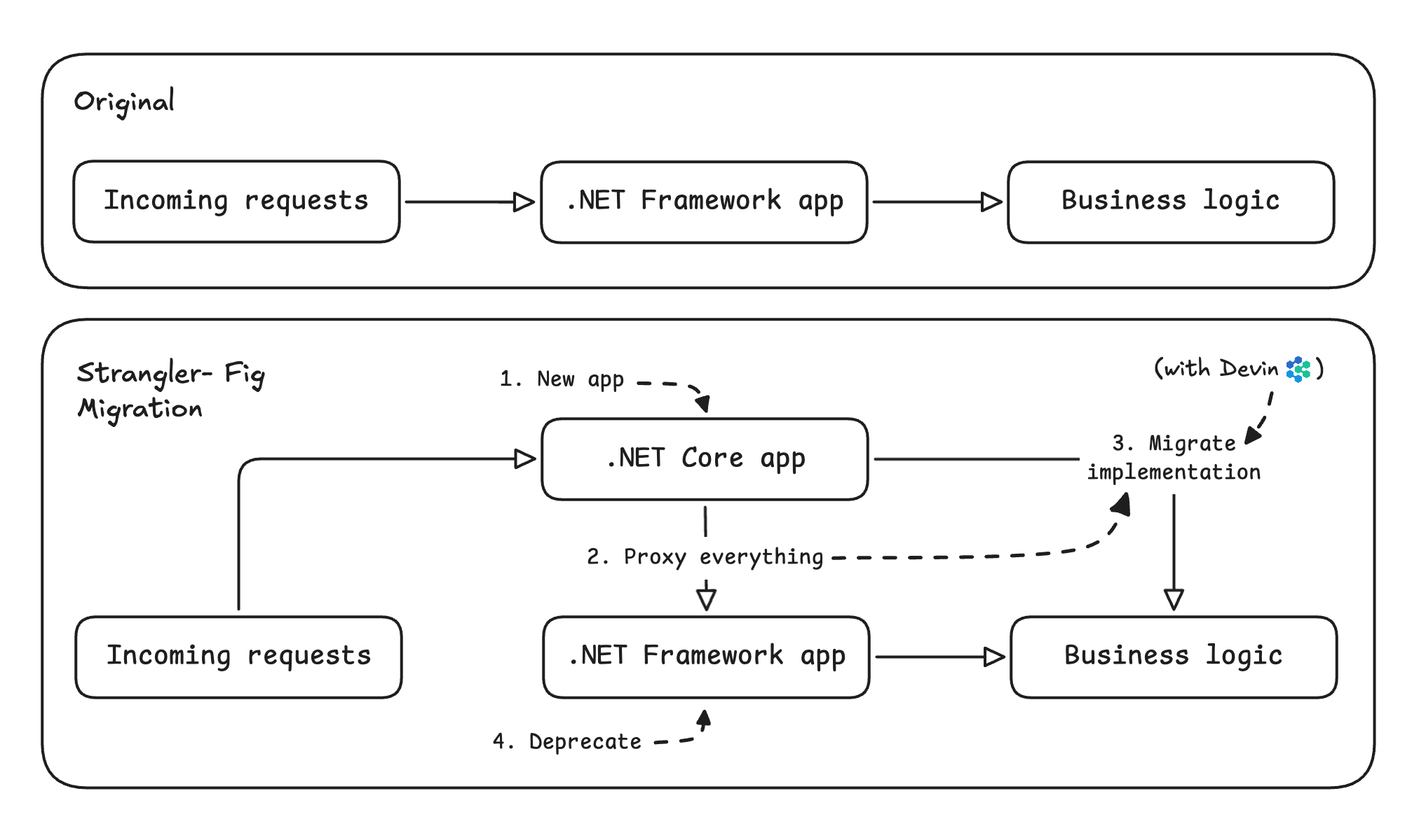 We’ve adapted Jimmy Bogard’s canonical migration guide — originally written for humans — into one for agents. The sections below detail how Devin automates each stage of a .NET Strangler Fig migration, step by step.