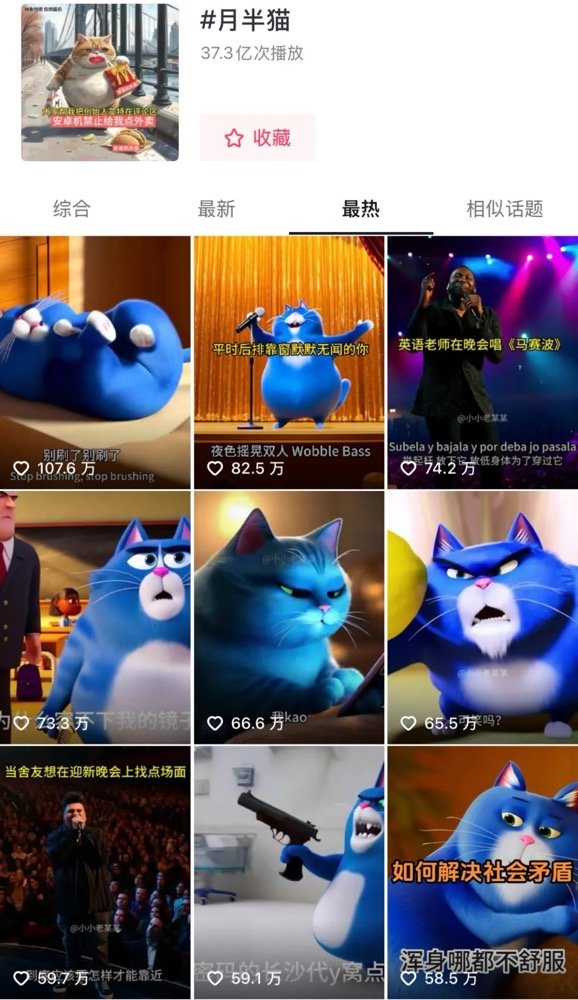 不过,在AI宠物短剧这条赛道上,洋抖落后国内至少一个季度。且不论佳作频出的AI年度抽象顶流——蓝色月半猫,它不仅喜欢吐槽,还会每天“报日历”般重复着“讨厌周一、喜欢周五”,网络热梗信手拈来,用一种“淡淡死感”的声音化身网友嘴替。