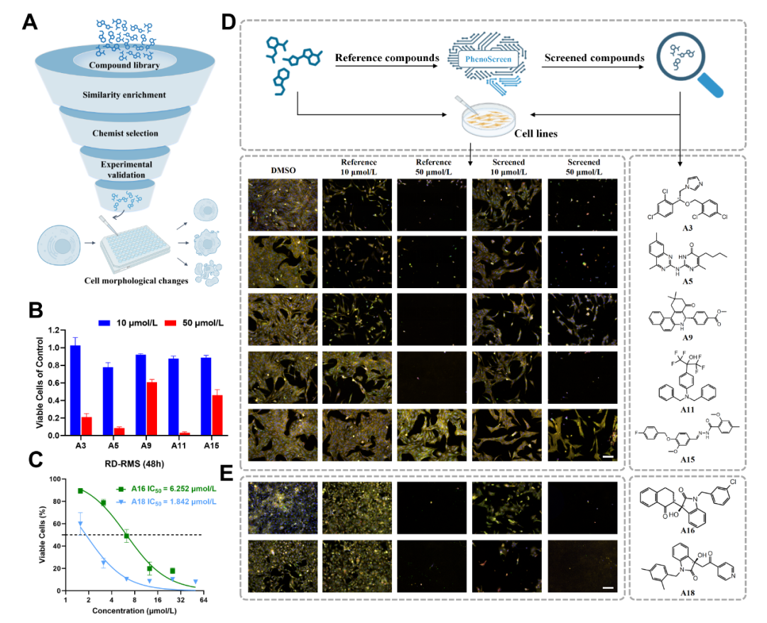 依托PhenoScreen,他们已发现多种对骨肉瘤与横纹肌肉瘤细胞分别表现出显著抑制活性的结构新颖的候选化合物,展示了该技术在多癌种方向上的广泛应用潜力(图2)。本研究表明,多模态信息融合与对比学习的研究策略可有效提升表型药物发现的效率与可推广性,为后续的分子作用机制阐释及先导化合物优化奠定了方法学基础,为表型驱动的药物发现提供了高效的计算工具。