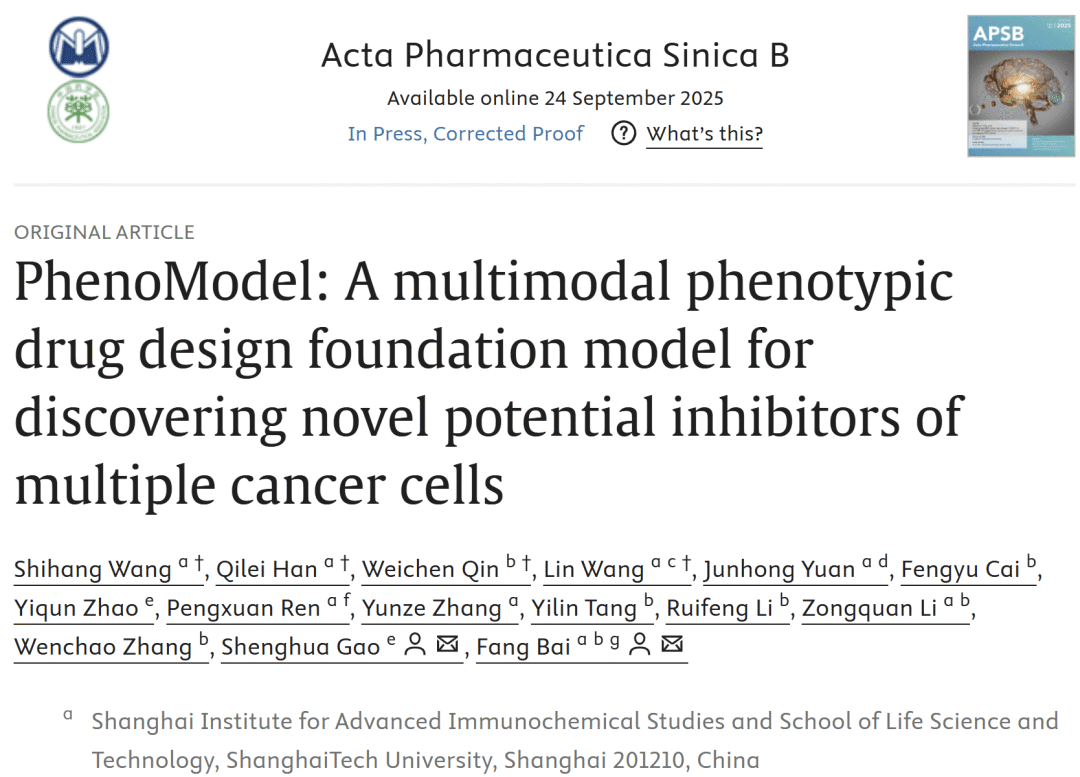 近日,上海科技大学免疫化学研究所白芳课题组与香港大学高盛华教授合作,在国际学术期刊《药学学报》英文刊(Acta Pharmaceutica Sinica B, APSB)上发表题为“PhenoModel: A Multimodal Phenotypic Drug Design Foundation Model for Discovering Novel Potential Inhibitors of Multiple Cancer Cells”的研究论文,提出多模态分子基座模型 PhenoModel,并衍生出表型驱动的活性化合物筛选技术PhenoScreen,为基于细胞表型扰动的活性化合物发现提供了新的人工智能方法。