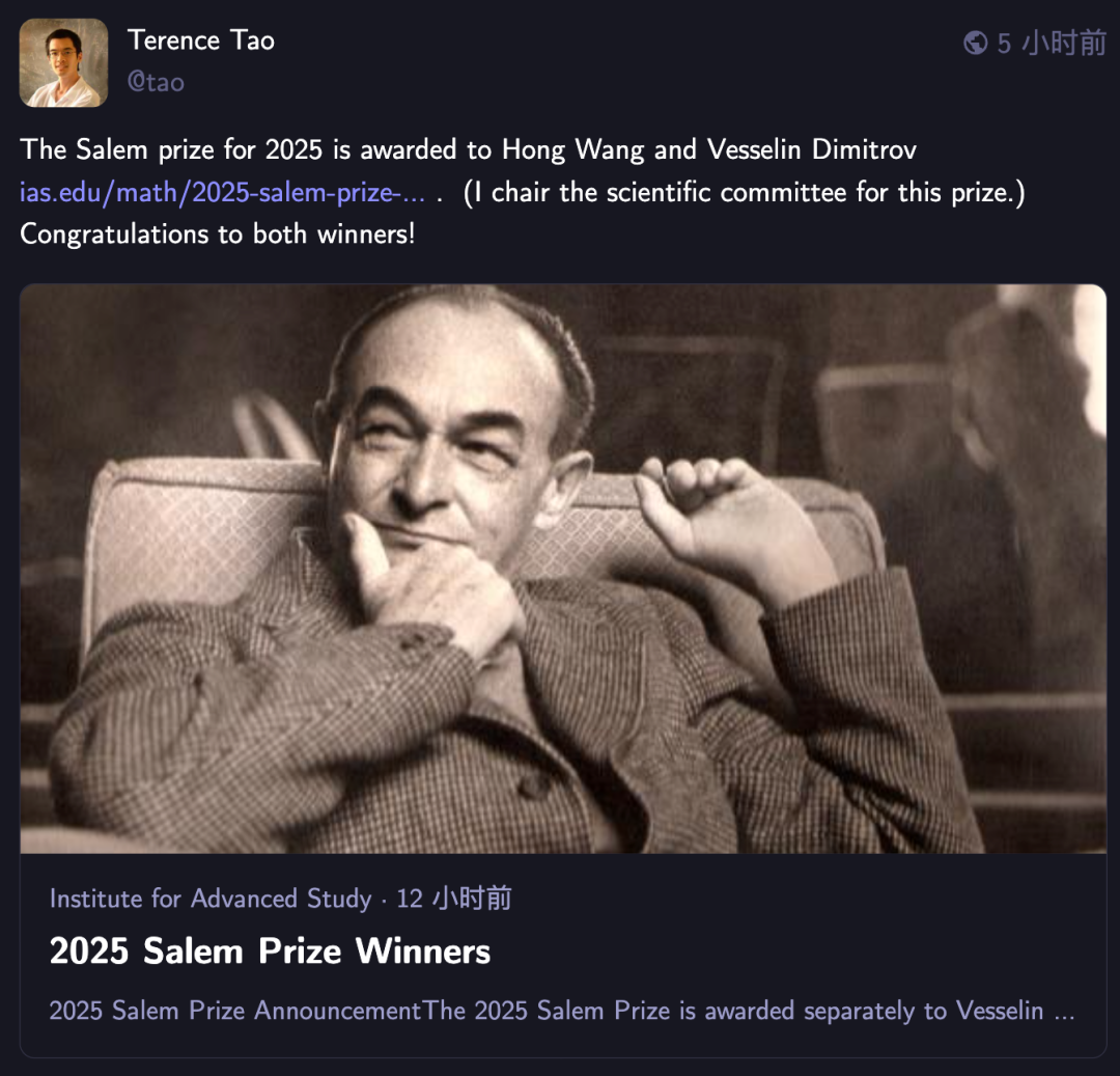 陶哲轩本人第一时间,为两大数学家送上了祝贺。