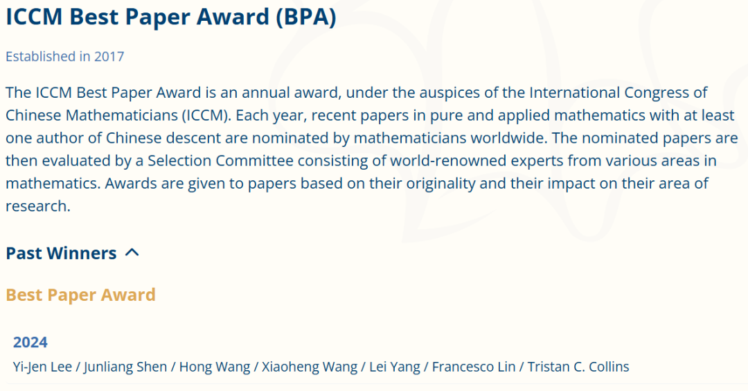 恰在昨天,王虹还荣获了「ICCM数学奖金奖」。同样,ICCM有着华人数学界「菲尔兹奖」之称的美誉。