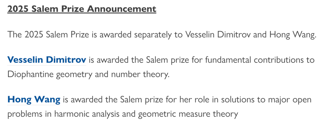 今天,34岁中国数学家王虹,拿下了2025 Salem Prize(塞勒姆奖)。