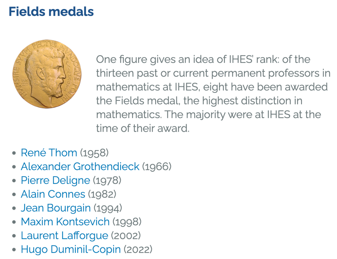 历史上,自1958年成立后,IHÉS数学领域终身教授一共12人,其中8人都拿下了菲尔兹奖。