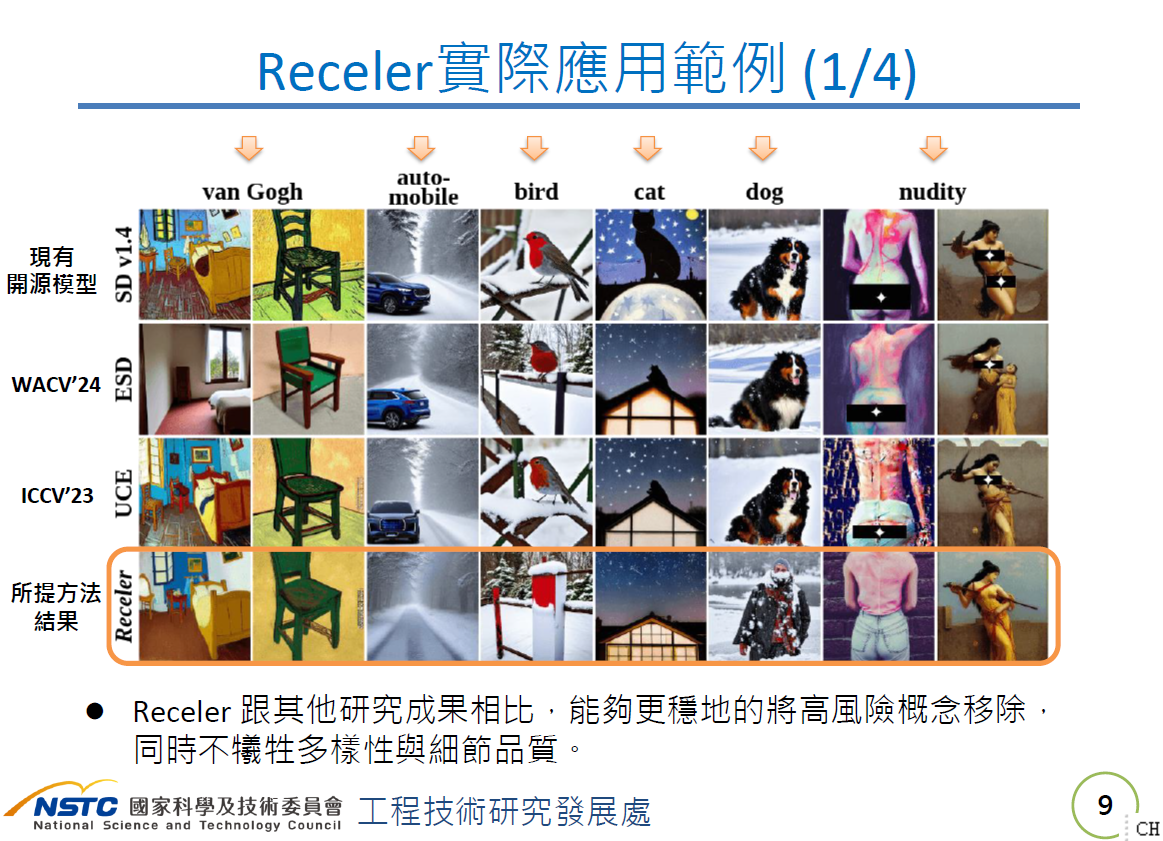 生成式AI應用遍地開花,但隨意生成的圖片,卻也產生侵權、濫用和倫理等問題。為改善這個痛點,臺大電機工程系團隊開發一款概念抹除技術Receler,就像是一款外掛,可搭配所有開源生成式AI模型使用,能在盡可能保持原有影像的條件下,精準地將不合規的概念抹除,如裸露、暴力、血腥等,又或是特定藝術家、品牌風格或深偽換臉等,開發者不必重新蒐集資料,也不必重新訓練整個模型。這項技術論文,還在2024年底國際頂尖的歐洲電腦視覺國際會議(簡稱ECCV)上發表。