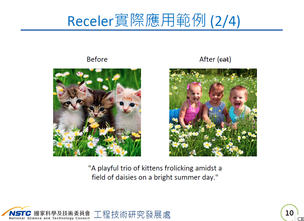 進一步來說,Receler是由臺大電機工程系教授王鈺強及臺大電信工程學研究所博士生黃啟斌、張凱博等人聯手打造。王鈺強解釋,生成式AI可產出文字、影像和語音,就影像生成來說,則透過文字指令輸入、AI模型生成、產出影像。但這種影像生成,可能造成侵權、倫理和濫用問題,比如DeepFake換臉、模仿特定藝術家風格等。於是,如何在不重新蒐集資料、不重新訓練模型的情況下,移除這些不合規的概念、同時保留原本模型的創作能力,成為團隊發想重點。