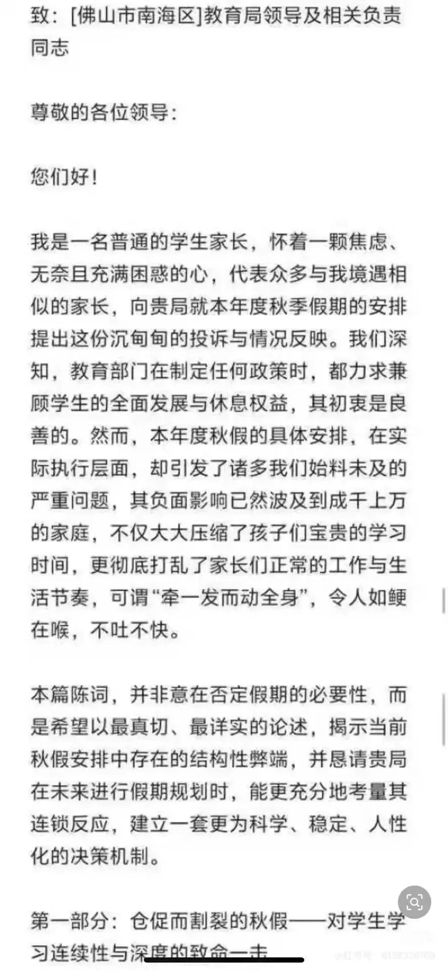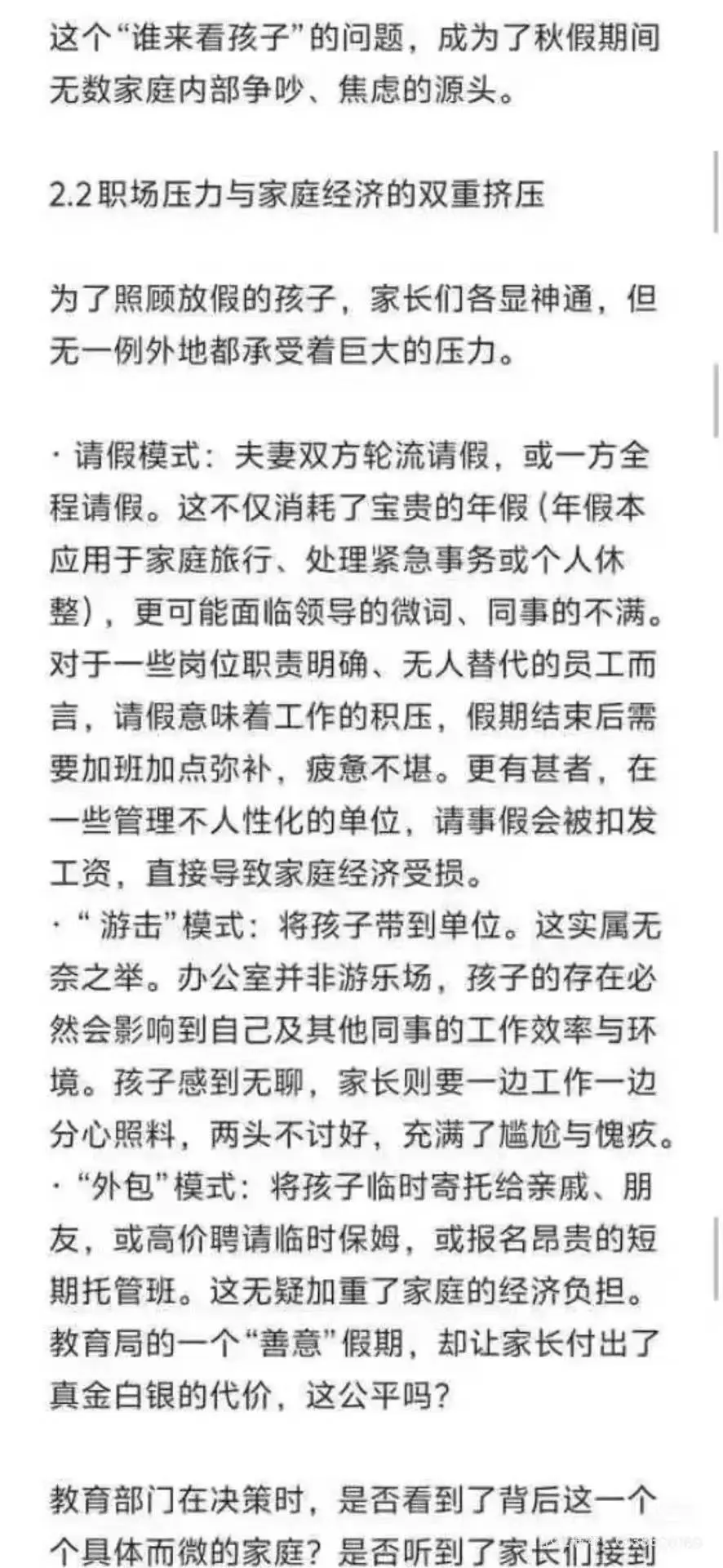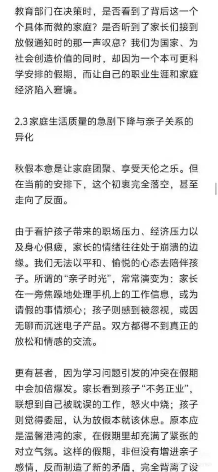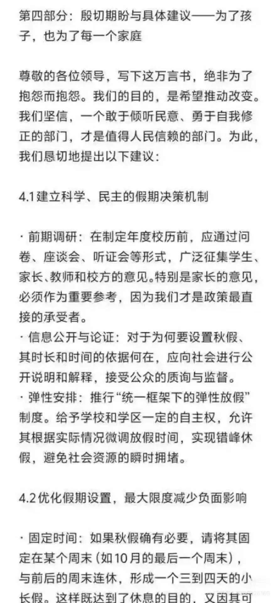 这位家长在文末还写道:“一个看似微小的假期安排,其背后牵连的是无数孩子的未来与无数家庭的稳定。我们恳请贵局能够真正俯下身子,倾听我们这些来自基层的、饱含焦虑与期待的声音。”