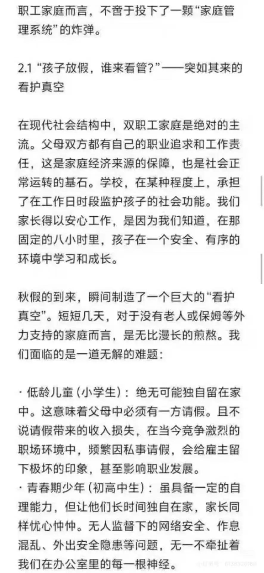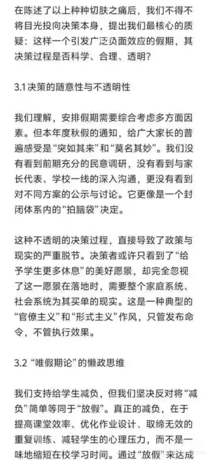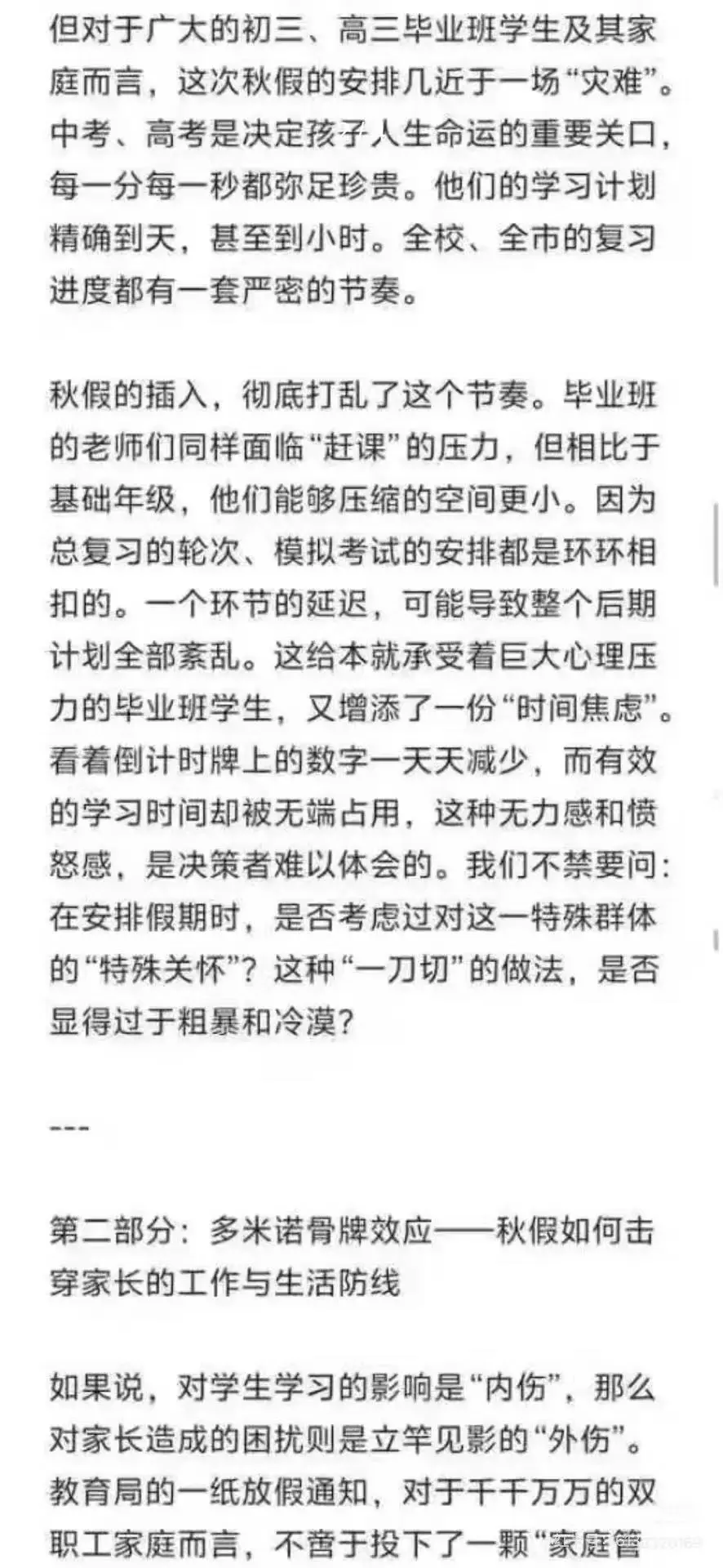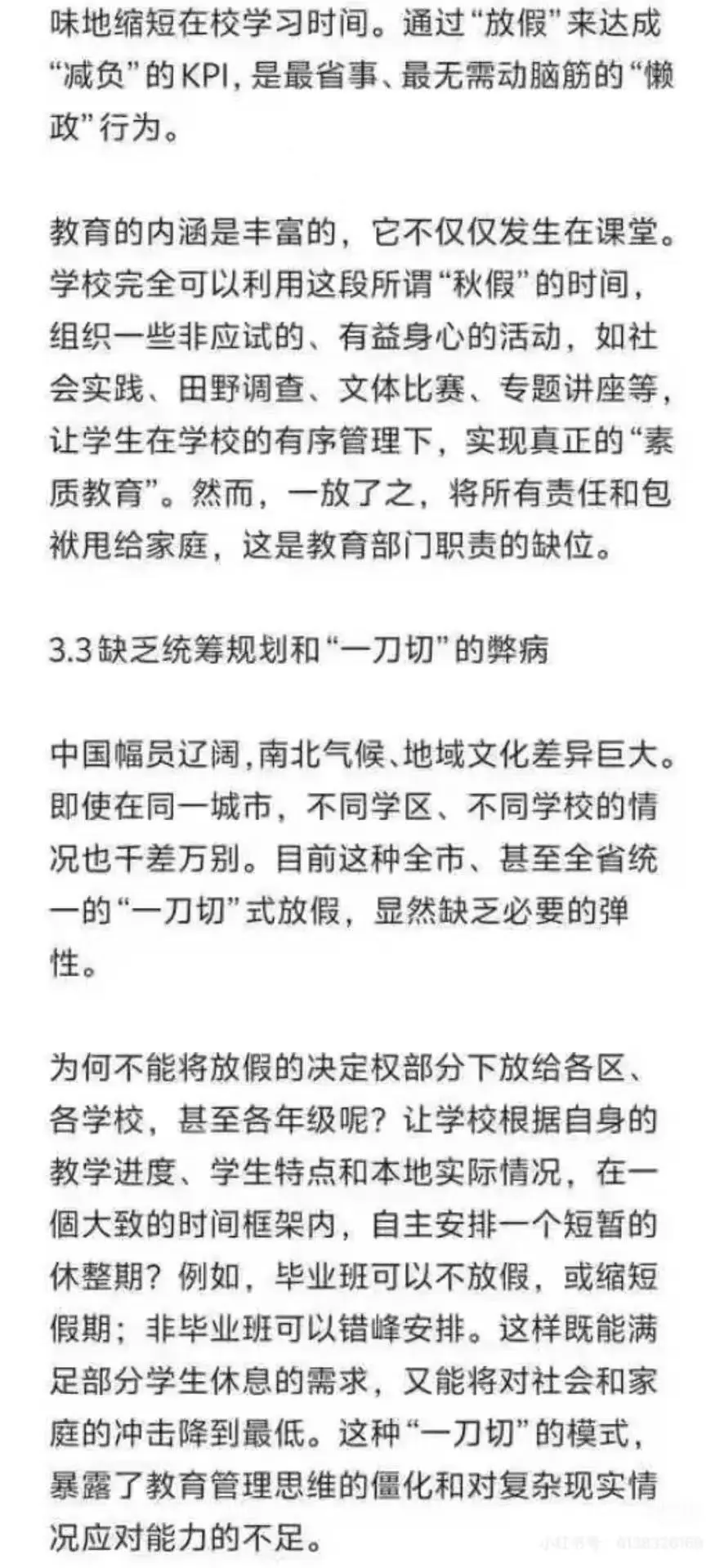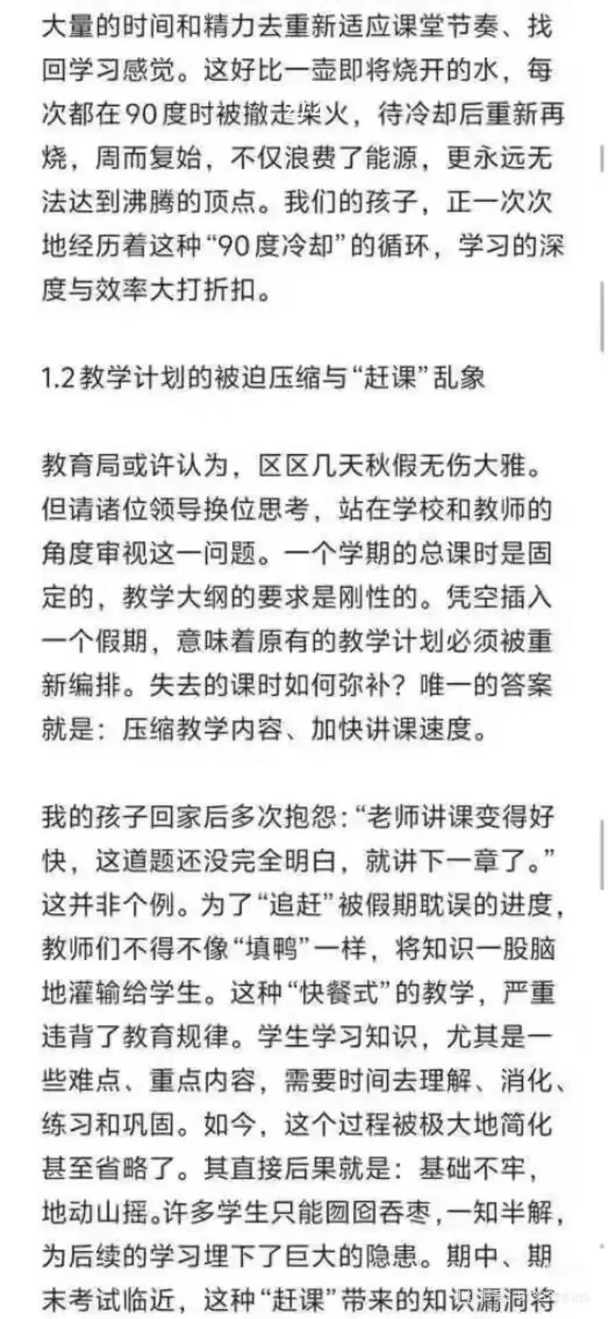 这位家长在文末还写道:“一个看似微小的假期安排,其背后牵连的是无数孩子的未来与无数家庭的稳定。我们恳请贵局能够真正俯下身子,倾听我们这些来自基层的、饱含焦虑与期待的声音。”