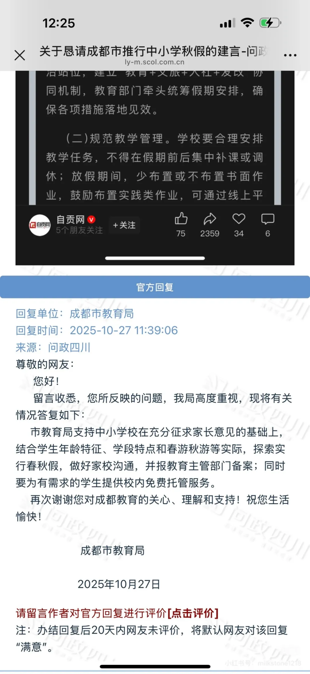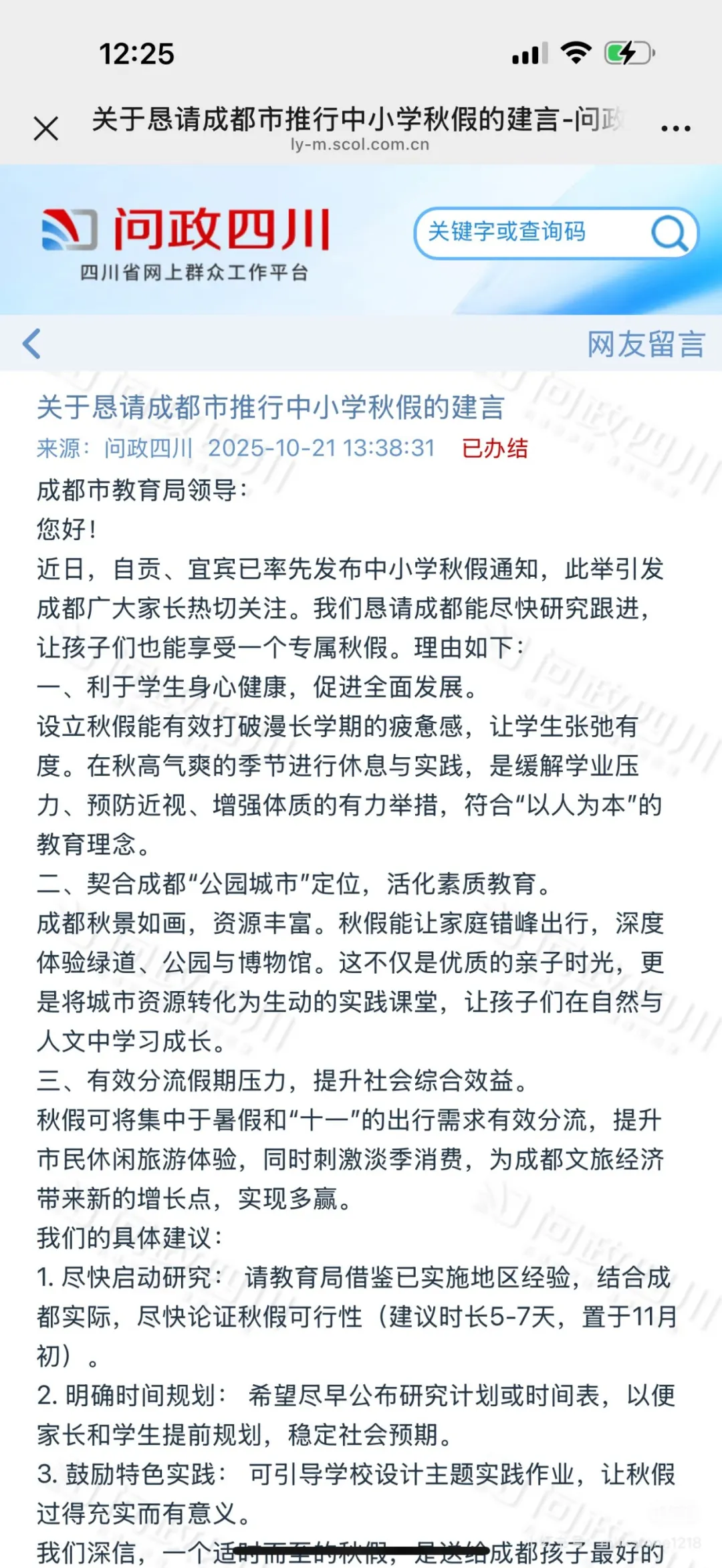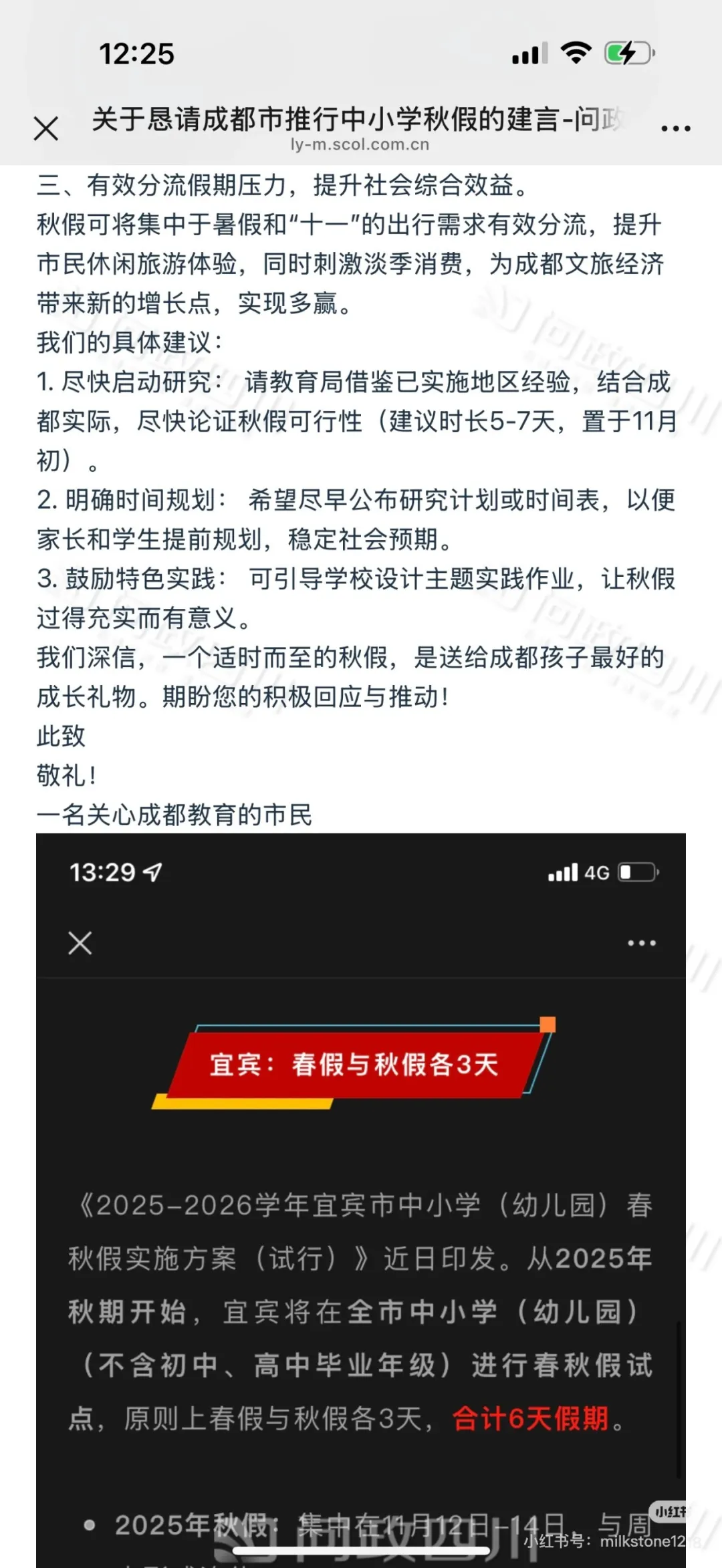 佛山官方的这套连招引爆了家长阵营中支持者的热烈回应,甚至还在全国各地引发了一系列连锁反应。有四川成都的家长就给当地官方网上留言称,希望成都尽快落实中小学春秋假,让孩子们享受一个专属假期。