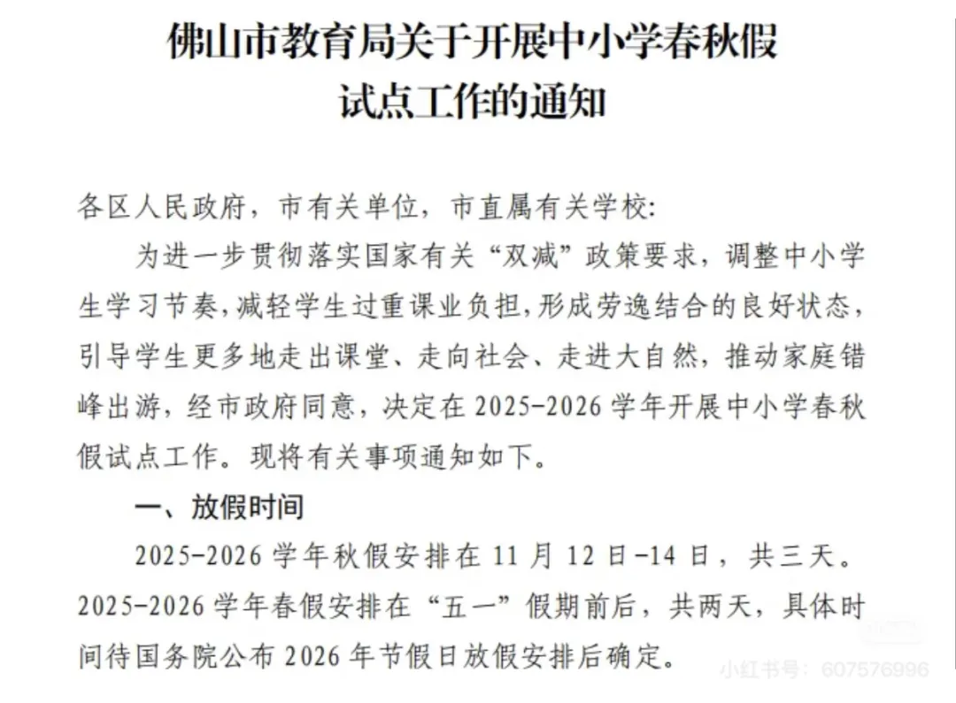 今年8月,《佛山市教育局关于开展中小学春秋假试点工作的通知》发布,根据官方安排,2025~2026学年秋假安排在11月12~14日,共三天,由于11月15和16日是周末,相当于佛山给全市中小学放了一个长达5天的公共小长假。