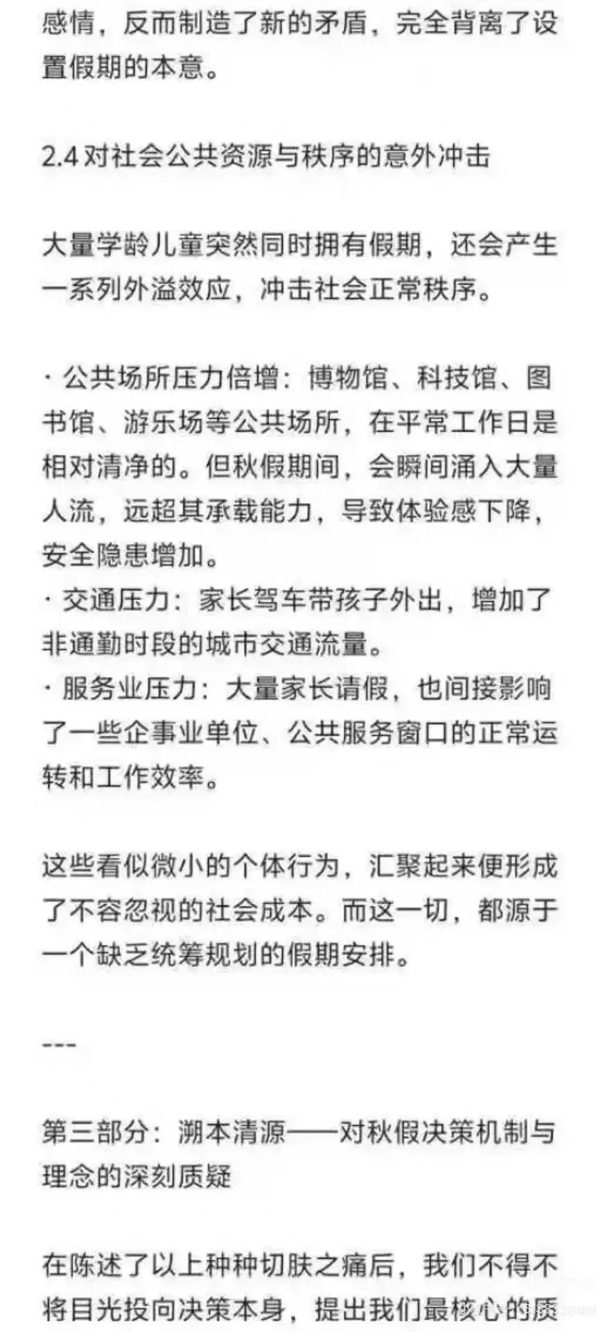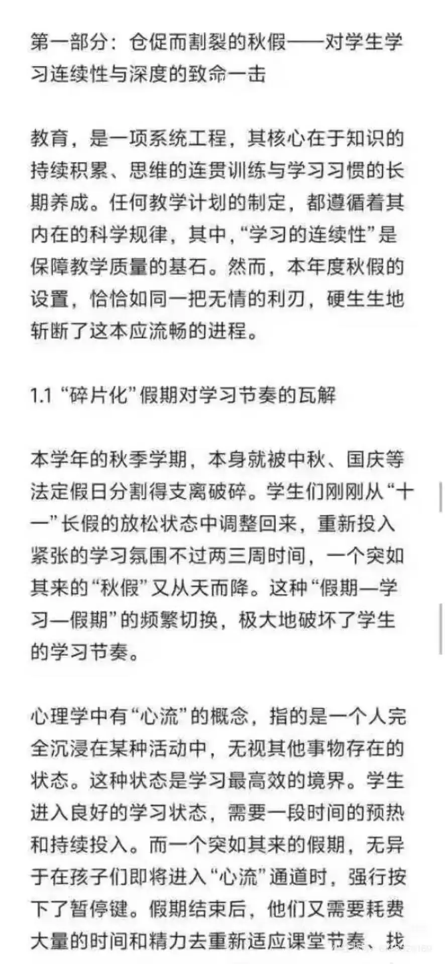 仔细阅读那位家长的万字长文公开信可以发现,这位家长从头到尾都没明确表态反对中小学春秋假制度。他甚至是认可中小学春秋假制度的设计思路是“力求兼顾学生的全面发展与休息权益,其初衷是良善的。”