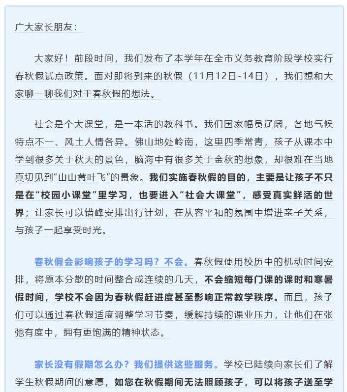在这封《佛山市教育局关于春秋假试点政策致广大家长的一封信》中,官方逐一正面回复家长质疑,并观点鲜明地提出: