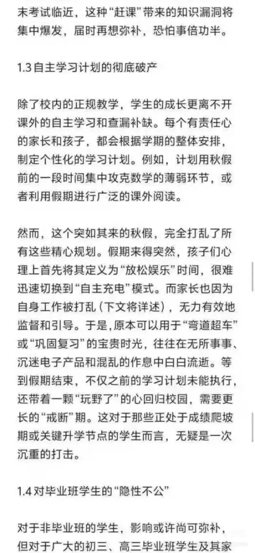 他和一批家长真正想要表达的是“本年度秋假的具体案例,在实际执行层面,却引发了诸多我们始料未及的严重问题。”最终结果就是让中小学春秋假流于形式,出现官方、学生和家长三输的局面。