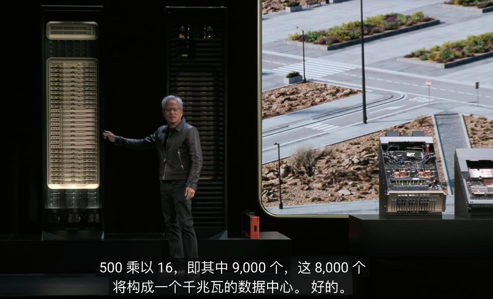现在,那是一个机架。一个千兆瓦级的数据中心会有,来算算,16个机架大约是姑且叫它 9,000,8,000 个这样的将是一个一千兆瓦的数据中心。所以那将是未来的 AI 工厂。