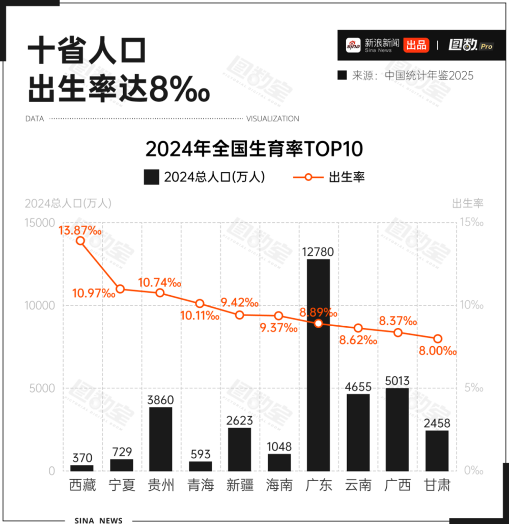 近日,国家统计局发布了《中国统计年鉴2025》,其中数据显示,2024年共有10个省份的人口出生率达到或超过8‰。