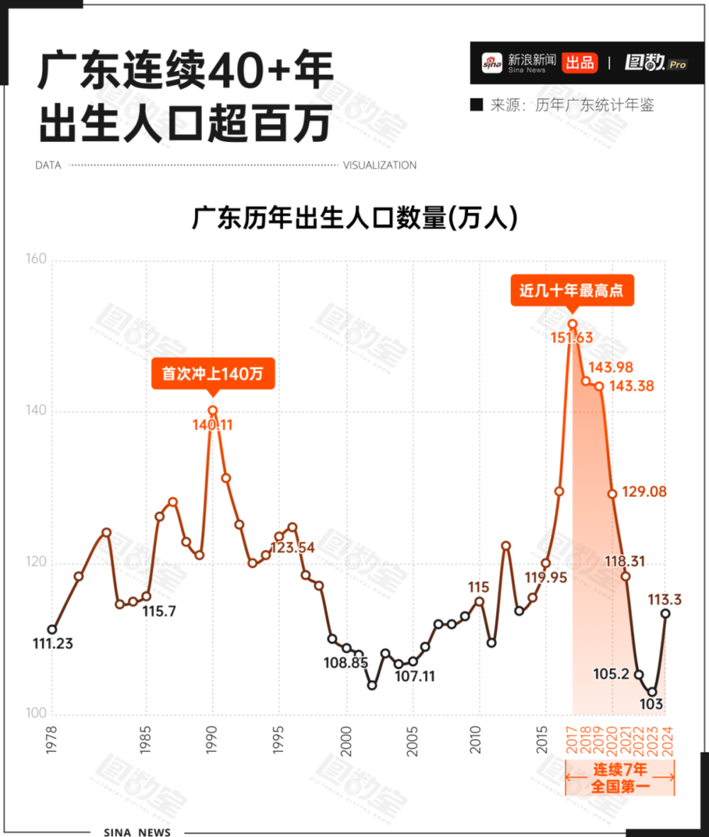 数据显示,2024年广东出生人口为113万人,比上一年增加了10万人,占出生人口954万人的11.88%。也就是说,全国每10个新生儿,就有一个是广东人。